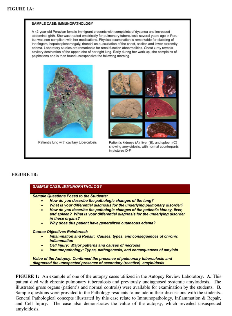 Recent innovations in medical education have featured early integration of clinical medicine into the curriculum as a strategy to engage medical students’ interest and facilitate recognition of the relevance of basic sciences to clinical practice.1 In our first-year General Pathology course, illustrative patient-based case presentations are offered whenever possible in lectures and in practical laboratories to demonstrate principles of General Pathology. An Autopsy Review Laboratory (ARL), utilizing actual autopsy cases, was designed to provide an effective learning experience for the integration of General Pathology concepts in a clinicopathological context. Autopsy cases illustrating the basic concepts previously introduced in the course were pre-selected for use in this educational endeavor.