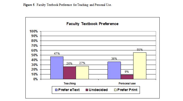 Faculty: Faculty were asked their level of agreement with the statement “Electronic textbooks were valuable for students” on a 5-point Likert scale from strongly disagree to strongly agree. The majority of respondents (59% for Fall 2007 & 57% for Spring 2008) agreed or strongly agreed that electronic textbooks were valuable for students with 12% or less disagreeing. A majority of faculty respondents (65%) across both semesters indicated that electronic textbooks were easy to integrate into their learning activities, while 18% disagreed. Faculty were also asked their preference for printed or electronic texts for teaching and personal use. Figure 5 provides the results for these questions. For teaching purposes, significantly more respondents across both semesters preferred electronic texts (47%) to printed textbooks (27%, z = 3.07, p =.002). For personal use, significantly more respondents across both semesters preferred printed texts (55%) over electronic (36%; z = 2.68, p = .007).